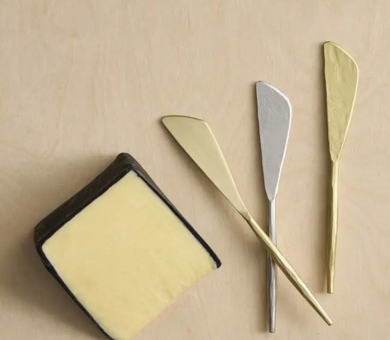 A trio of small, blunt-edged knives, each with a different finish. Steel knives with a hammered brass finish, a hammered pewter finish, and a smooth brass finish are just what's needed to gently cover bread or crackers with butter, soft cheese, dips or jam.